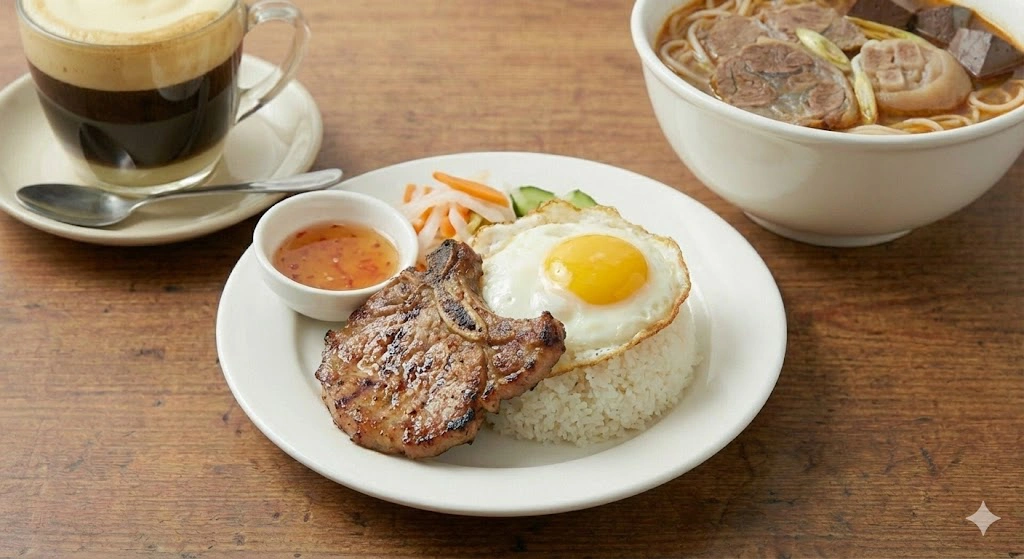 Southern staple. Broken rice grains served with grilled pork chop, egg meatloaf, and fish sauce.